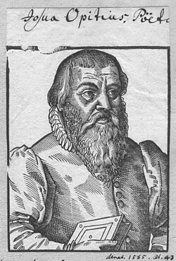 - ↑ Bernhard Raupach: M. Josua Opitius, in: Presbyterologia Austriaca, Felginer Witwe & Bohn, Hamburg 1741, S. 134f.; s. hier unter Quellen, zitiert auch bei Michael Eichler: Ein christliche Leichpredigte, Aus dem 91. Psalm … gehalten vber der Leiche der tugendsamen Frawen Judithe, weyland dess Ehrwirdigen Herren Josuae Opitij, Pfarrherrs zu Büdingen, Seligen Haussfrawen. Geschehen daselbsten den 27. Octobris. Im 1584. Jare. Nikolaus Heinrich d. Ä., Ursel 1585