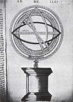 Dice (1936): Ilustración de un tratado de astronomía hecha por J. de Herrera. Según original existente en la biblioteca de El Escorial. | Agustín Ruiz de Arcaute (1889–1967): Juan de Herrera. Arquitecto de Felipe II. Edited by Javier Ortega Vidal, Instituto Juan de Herrera, Escuela Técnica de Arquitectura, Madrid 1997 (first issued 1936), p. 17 | Juan de Herrera (b. 1533, d. 1597) | Datei:Herreras Astrolabium.jpg | |