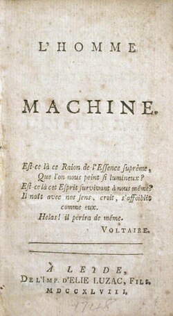 | L'Homme Machine, di Julien Offray de La Mettrie | http://rationalrevolution.net/images/LaMettrie-1748-0tp.jpg | Julien Offray de La Mettrie | Datei:LaMettrie L'homme machine.jpg | |