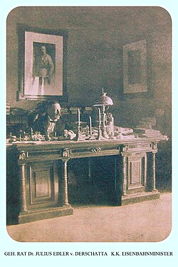 | Dr. Julius Edler von Derschatta 1908 | Österreichs Illustrierte Zeitung, Ausgabe 2. Dezember 1908 (Kaiserfestnummer), S. 88 | Fotograf unbekannt | Datei:Julius Derschatta Eisenbahnminister.JPG |