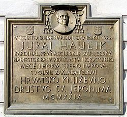 | A tablet on the house where Juraj Haulik was born, Trnava, Slovakia. | Eigenes Werk | Martin Hlauka (Pescan) 17:15, 16 August 2007 (UTC) | Datei:Juraj Haulik-Trnava.jpg | |
