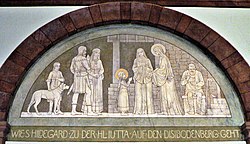| Die achtjährige Hildegard von Bingen (Mitte) wird zu Jutta von Sponheim (Mitte rechts) auf den Disibodenberg gebracht. (Teilausschnitt aus dem Hildegardaltar der St. Rochuskapelle, Bingen) | http://www.heiligenlexikon.de/BiographienH/Hildegard_von_Bingen.html | Autor/-in unbekannt Unknown author | Datei:JDie achtjährige Hildegard von Bingen (Mitte) wird zu Jutta von Sponheim (Mitte rechts) auf den Disibodenberg gebracht.jpg | |