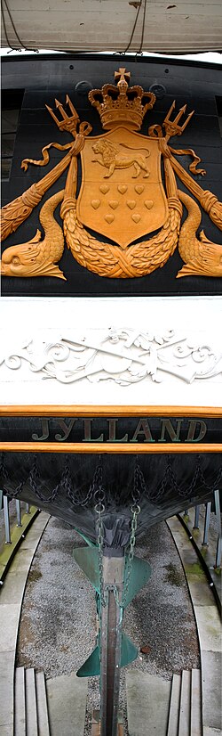 | Heckpanorama der Fregatte Jylland von 1856, Ebeltoft (DK) | selbst fotografiert, mit Photoshop aus mehreren Bildern zusammengesetzt, Bildmaterial 03/2010 | McKarri 10:50, 14. Aug. 2011 (CEST) | Datei:Fregatte Jylland (DK).Heckpanorama.jpg | |
