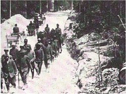- ↑ Das Kriegstagebuch des „115° Reggimento fanteria“ nennt 28 Tote, 468 Verwundete und 572 Vermisste. Letztere Zahl passt sehr gut zu Ellison, Kriegstagebuch, der 228 gefallene Italiener, 246 unverwundete und 108 verwundete Gefangene nennt.