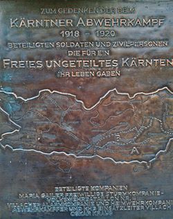 | Gedenkplatte eines Denkmals für den Kärntner Abwehrkampf beim Silbersee in Villach, Kärnten. | Selbst fotografiert | MoserB | Datei:Gedenkplatte für Kärntner Abwehrkämpfer.jpg | |