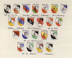 | Coats of arms of the Kösen corps restituting the KSCV in 1950 | Einst und Jetzt , Jahrbuch des Vereins für corpsstudentische Geschichtsforschung, vol. 55 (2010), p. 406 (Album Hofer) | public | Datei:Corps in der IG.JPG | |
