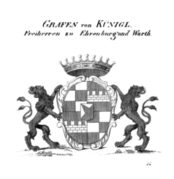 | Wappen der Grafen Künigl, Freiherrn zu Ehrenburg und Warth | Tyroff: Wappenbuch des höheren Adels der deutschen Bundesstaaten , 1846–1865, Scan von Google / Bayerische Staatsbibliothek | Autor/-in unbekannt Unknown author | Datei:COA Künigl Ehrenburg u Warth - Tyr HA.png | |