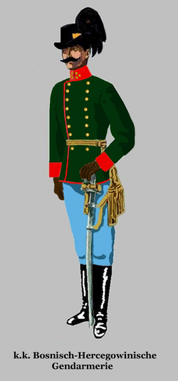| Hauptmann der k.k. Bosnisch-Hercegowinischen Gendarmerie in Paradeadjustierung | Eigenes Werk (Nach einem Gemälde im Heeresgeschichtlichen Museum in Wien. Details und Farben sind entnommen der Egalisierungsvorschrift des k.u.k. Kriegsministerium für die k.u.k. Armee, die k.k. Landwehr, die k.u. Landwehr, die verbundenen Einrichtungen und das Corps der Militär-Beamten von 1867 - Ausgabe von 1912) | Vormeister | Datei:BhGen Kpie.png | |