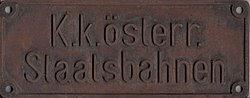 | Metallschild der "K.k.österr. Staatsbahnen". Das Metallschild befindet sich in meinem Privatbesitz. Abmessungen des Originals 28x11 cm. | Norbert Luffy | Norbert Luffy | Datei:KK österr Staatsb.jpg | |