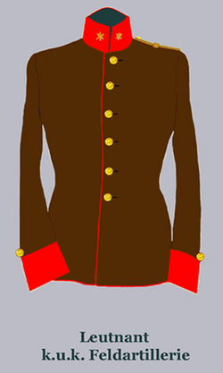 | Offiziers-Waffenrock der k.u.k. Feldartillerie nach 1908(Details und Farben sind entnommen der Egalisierungsvorschrift des k.u.k. Kriegsministerium für die k.u.k. Armme, die k.k. Landwehr, die k.u. Landwehr, die verbundenen Einrichtungen und das Corps der Militär-Beamten von 1867 - Ausgabe von 1912) | Eigenes Werk | Steinbeisser | Datei:FeldArtillerie n08.png | |