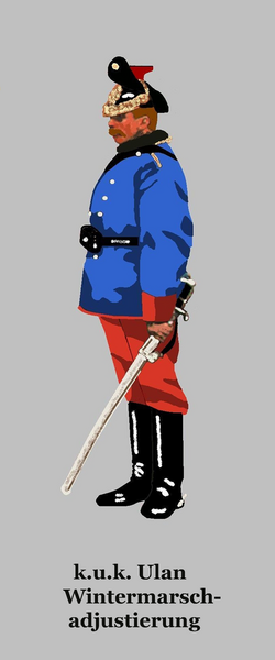 | k.u.k. Ulan in Marschadjustierung. Diese Uniform wurde bis ca. 1916 getragen | Eigenes Werk (Nach einem Gemälde im Heeresgeschichtlichen Museum in Wien. Details und Farben sind entnommen der Egalisierungsvorschrift des k.u.k. Kriegsministerium für die k.u.k. Armee, die k.k. Landwehr, die k.u. Landwehr, die verbundenen Einrichtungen und das Corps der Militär-Beamten von 1867 - Ausgabe von 1912) | Vormeister | Datei:K.u.k. Ulan in Wintermarschadjustierung.png | |