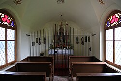 | Kaiser-Franz-Joseph-Jubiläumskapelle am Haunsberg, Kapelleninneres, Blick zur Apsis, der Altarraum ist mit einem Gitter abgegrenzt, die Fenster haben im Rundbogenbereich ein Holzmaßwerk und eine farbige Verglasung | Eigenes Werk | Anton-kurt | Datei:Kaiser-Franz-Joseph-Jubiläumskapelle am Haunsberg 04.jpg |