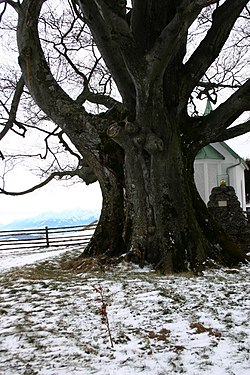 | Kaiserbuche auf dem Haunsberg mit vergoldeter Krone und Kapelle gepflanzt am 29. August 1868 zur Erinnerung an der Besuch von Kaiser Josef II. im Jahre 1779, fotografiert am 25. Dezember 2003 | Eigenes Werk | Manuel Heinrich Emha | Datei:Kaiserbuche.jpg | |