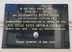 | Gedenktafel für das Sechshauser Bezirksspital und Pater Anton M. Schwartz, der hier als Seelsorger tätig war, an einer Schule in der Sechshauser Straße 71 in Rudolfsheim-Fünfhaus in Wien | Eigenes Werk | GuentherZ | Datei:GuentherZ 2012-07-06 0054 Wien15 SechshauserStrasse071 Gedenktafel Sechshauser Bezirksspital.jpg | |