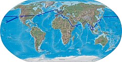 | Weltreise von König Kalākaua im Jahre 1881; schematische Ansicht der besuchten Länder und allgemeine Reihenfolge, keine genaue Reiseroute, doppelte Aufenthalte (London, Paris) nicht berücksichtigt | map template: The World Factbook (public domain) ; cf. Copyright notice at Site Policies ; cf. World map 2004 CIA large 1.7m whitespace removed.jpg | Urheber dieser Datei ist Thomas Tunsch . Sie ist nicht gemeinfrei und die Verwendung über die Lizenzbedingungen hinaus ist eine Urheberrechtsverletzung. Als Rechtenachweis (Namensnennung des Urhebers) ist anzugeben: © CC BY-SA Thomas Tunsch / Kalakaua journey round the world.jpg (Wikimedia Commons) . Ein Quellennachweis durch Verknüpfung mit dieser Beschreibungsseite ( //commons.wikimedia.org/wiki/File:Kalakaua_journey_round_the_world.jpg ) wird empfohlen. Der Lizenzhinweisgenerator kann dabei helfen, Bilder aus Wikipedia und dem freien Medienarchiv Wikimedia Commons einfach und rechtssicher nachzunutzen. | Datei:Kalakaua journey round the world.jpg | |