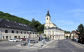 Das Ortszentrum von der ehemaligen eigenständigen Gemeinde Kalksburg mit der in erhöhter Lage errichteten röm.-kath. Pfarrkirche hl. Petrus im 23. Wiener Gemeindebezirk Liesing . Links der Kalksburg-Kirchenplatz und rechts die Breitenfurter Straße, über die der Schwibbogen des Mack-Schlössls errichtet ist. | Eigenes Werk | C.Stadler/Bwag | Datei:Kalksburg - Ortszentrum.JPG | |