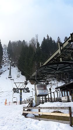 | Die Kapellbahn im Silbertal in Vorarlberg ( Österreich ) ist eine Zweier-Sesselbahn, die 1981 von der Fa. Doppelmayr (Wolfurt) errichtet wurde. Das Skigebiet, welches durch die Kapellbahn erschlossen wird, gehört zum HochjochSilvretta-Montafon. Die Talstation liegt auf 855 m.ü.M und die Bergstation auf 1752 m.ü.M (Höhendifferenz 897 m). Streckenlänge 1889 m, Mittlere Neigung 54,60 %, Größte Neigung 96,20 %, bei 22 Stützen. Die maximale Förderleistung beträgt 656 Pers/h bei einer Fahrzeit von 13,9 min und einer Fahrgeschwindigkeit von 2,3 m/s. | Eigenes Werk | Asurnipal | Datei:Silbertal-Kapellbahn-01.jpg | |