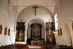 Das Kirchenschiff ist fensterarm und hat ein Tonnengewölbe mit Stichkappen, der gerade geschlossene Altarraum ist gleichfalls tonnengewölbt. An der Ostseite der Kirche sind zwei Kapellen mit nahezu quadratischem Grundriss angebaut, die über spitzbogige Öffnungen mit dem Schiff verbunden sind. Nordseitig des Chores befindet sich der Chorraum der Klosterbrüder mit einem ehemaligen Altarbild von August Veiter.