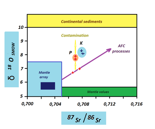| D18O versus 87Sr/86Sr diagram showing the position of the Karawanken tonalites (K) in comparison to the Pohorje magmatites (P) in the Slowenian Alps. The tonalites are more contaminated by crustal magmas. | Eigenes Werk | Rudolf Pohl | Datei:O18Karawanken.png |