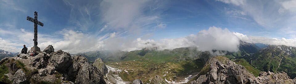 | Gipfelpanorama in Richtung Norden auf dem Karhorn 2.416m . Das Panorama zeigt unter anderem den Grenzverlauf zwischen Österreich und Deutschland. Links der Bregenzerwald und das Kleinwalsertal mit dem Hochalppass bei der Höferspitze. Im Tal der Hochtannbergpass mit dem markanten Großen Widderstein 2.533m . Mitte-rechts am Warther Horn die Gemeinde Warth sowie Lechleiten im Tirol am Fuße des Biberkopf 2.599m . Der Oberlauf des Lech (Fluss) trennt das Gebirge rechts mit der Mittagsspitze, Rappenspitze und der Schäferköpfe. Die Tristelleralpe begrenzt den rechten Bildrand. | Eigenes Werk | Böhringer Friedrich | Datei:Karhorn Gipfel Panorama.jpg | |