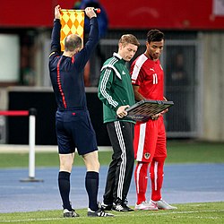 | Friendly match – Austria (red shirts) vs. Switzerland (white shirts) 1-2 (1-2) – 2015-11-17 in Vienna , Ernst-Happel-Stadion – The photo shows(from left to right) assistent referee Mike Pickel, fourth official Christian Dingert and Karim Onisiwo. | Eigenes Werk | Steindy ( Diskussion ) 12:15, 25 November 2015 (UTC) | Datei:AUT vs. SUI 2015-11-17 (064).jpg | |