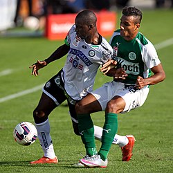 | Match of the Austrian Football Bundesliga – SV Mattersburg (green shirts) vs. SK Sturm Graz (white shirts) on 2015-09-13 in Pappelstadion , Mattersburg – The photo shows Wilson Kamavuaka (left) and Karim Onisiwo (right) | Eigenes Werk | Steindy ( Diskussion ) 20:45, 21 September 2015 (UTC) Permission= Kameraposition 47° 44′ 21,66″ N, 16° 24′ 23,13″ O Dieses und weitere Bilder auf OpenStreetMap 47.739350; 16.406425 Die Herstellung oder Freigabe dieser Datei wurde durch Spenden an Wikimedia Österreich unterstützt. Weitere Dateien, die durch Unterstützung von Wikimedia Österreich hier veröffentlicht wurden, finden sich in der Kategorie Supported by Wikimedia Österreich . | Datei:SV Mattersburg vs. SK Sturm Graz 2015-09-13 (076).jpg | |