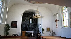 Dominiert wird der Innenraum von der 1888 eingerichteten Lourdesgrotte, wobei die im Chor befindlichen Rundbogenfenster verbaut wurden. Die Einrichtung ist – abgesehen von den Gemälden und der Grotte – schlicht gehalten.