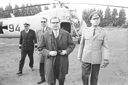 | Begrüßt vom Chef des Stabes beim Wehrbereichskommando I Brigadegeneral Gerhard Schmidt (rechts). | Stadtarchiv Kiel | Magnussen, Friedrich (1914-1987) | Datei:Staatssekretär von Hase trifft per Hubschrauber auf dem Flandernplatz ein (Kiel 43.506).jpg | |