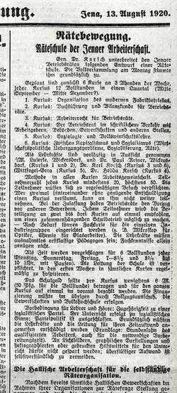 | Artikel Räteschule der Jenaer Arbeiterschaft aus der Beilage zur Neuen Zeitung (Jena), 2. Jahrgang, Nr. 177, S. 1, rechte Spalte. Durch einen Satzfehler auf der Beilage wird dort fälschlich 3. Jahrgang angegeben, lt. Stadtarchiv Jena handelt es sich jedoch um den 2. Jahrgang. | Stadtarchiv Jena, Constanze Mann | Autor/-in unbekannt Unknown author | Datei:Neue zeitung 2jahrg nr177 beilage 13 aug 1920 cropped.png | |