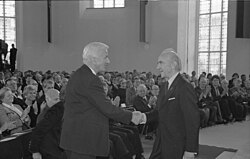 | Es folgt die historische Originalbeschreibung , die das Bundesarchiv aus dokumentarischen Gründen übernommen hat. Diese kann allerdings fehlerhaft, tendenziös, überholt oder politisch extrem sein. Frankfurt, 7. Oktober 1990 Der Direktor des Deutschen Polen-Instituts, Dr. Karl Dedecius, wurde in der Frankfurter Paulskirche mit dem diesjährigen Friedenspreis des Deutschen Buchhandels ausgezeichnet. | Dieses Bild wurde im Rahmen einer Kooperation zwischen dem deutschen Bundesarchiv und Wikimedia Deutschland aus dem deutschen Bundesarchiv für Wikimedia Commons zur Verfügung gestellt. Das deutsche Bundesarchiv gewährleistet eine authentische Bildüberlieferung nur durch die Originale (Negative und/oder Positive), bzw. die Digitalisate der Originale im Rahmen des Digitalen Bildarchivs . | Lemmerz, Wolfgang | Datei:Bundesarchiv B 145 Bild-F085868-0007, Frankfurt, Friedenspreis des Deutschen Buchhandels.jpg | |
