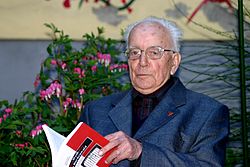| Historiker, Soziologe, Buchautor und Zeitzeuge Professor Karl FLANNER (Wiener Neustadt) mit seinem neuen Buch „Rot-Weiß-Rot in Buchenwald“ | Photo by Steindy | Steindy 11:19, 12. Apr. 2008 (CEST). | Datei:Professor Karl Flanner mit seinem neuen Buch 02.jpg |