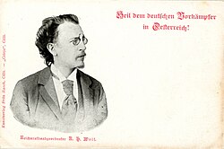 So gründete Wolf mit seinen Unterstützern Raphael Pacher, Josef Herold und Anton Schalk 1903 die Freie Vereinigung Alldeutscher Abgeordneter (kurz Freialldeutsche Vereinigung), die sich 1907 in Deutschradikale Partei umbenannte. Bis 1905 traten die meisten Abgeordneten der Schönerer-Gruppe zur Freialldeutschen bzw. Deutschradikalen Partei über, die vor allem in den deutschsprachigen Gebieten Böhmens, Mährens und Schlesiens gewählt wurde. Anders als die Schönerer-Bewegung beharrte sie nicht auf einer Zerschlagung der Habsburgermonarchie, sondern versuchte innerhalb dieser die Vorherrschaft der deutschen Volksgruppe zu erhalten. Ihr Antisemitismus war im Vergleich zu Schönerer etwas gedämpfter.[9] Nach der Einführung des allgemeinen Wahlrechts und dem Neuzuschnitt der Wahlkreise wurde Wolf bei den Reichsratswahlen 1907 (XI. Legislaturperiode) und 1911 (XII. Legislaturperiode) als Abgeordneter des in den Sudeten gelegenen Wahlbezirks Böhmen 95 (Städte Trautenau, Braunau, Grulich, Landskron) erneut in das Wiener Parlament gewählt.[5]