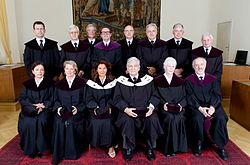 Gruppenfoto der Zusammensetzung des österreichischen Verfassungsgerichtshofs im Juni 2007. Vorne (v.l.n.r.): Claudia Kahr , Eleonore Berchtold-Ostermann , Vizepräsidentin Brigitte Bierlein , Präsident Karl Korinek , Lisbeth Lass , Kurt Heller Hinten (v.l.n.r.): Christoph Grabenwarter , Gerhart Holzinger , Herbert Haller , Karl Spielbüchler , Peter Oberndorfer , Rudolf Müller , Hans Georg Ruppe , Willibald Liehr | Constitutional Court of Austria Verfassungsgerichtshof (VfGH) | VfGH/Achim Bieniek | Datei:Gruppenfoto VfGH 2007.jpg | |