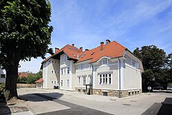 Die ehemalige landwirtschaftliche Fachschule (Dr.-Carl-Kupelwieser-Straße 20) in Heuberg, ein Ortsteil der niederösterreichischen Marktgemeinde Pyhra . Ein Komplex aus 2 unregelmäßig gestalteten zwei bis dreigeschossigen Gebäuden unter Walmdach und mit Rieselputzfassade sowie Natursteinsockel. Gestiftet vom Gutsherrn zu Kirnberg Karl Kupelwieser und 1913 errichtet. | Eigenes Werk | C.Stadler/Bwag | Datei:Heuberg - ehem. landwirtschaftliche Fachschule.JPG | |