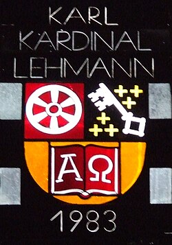 | Mainzer Rad in den Wappen des Mainzer Bischofs. 3 Chor und 16 Schiffenster. Entwurf: Prof. Anton Wendling Ausführung: Hein Derix aus Kevelaer | Eigenes Werk | User:Kandschwar | Datei:1983-20xxKarlKardinalLehmann.jpg | |