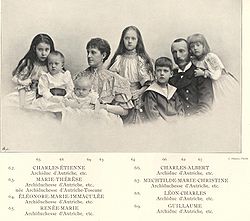 | Erzherzog Karl Stephan of Österreich-Teschen (1860-1933), his wife Erzherzogin Maria Theresia Antoinette (1862-1933) von Österreich-Toscana, mit Kinder, Foto aus dem Jahre 1896. | Dies ist ein Scan des historischen Dokuments: Von Wrangel: Les Maisons Souveraines de l'Europe , Stockholm, 1899. | Der ursprünglich hochladende Benutzer war Alexvonf in der Wikipedia auf Deutsch Übertragen aus de.wikipedia nach Commons durch Akela3 . | Datei:Karl Stephan Austria 1860 1933 family1896.jpg | |
