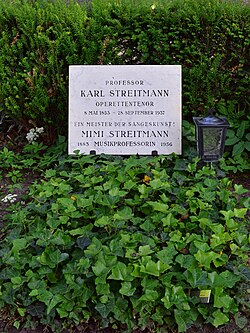 | Ehrenhalber gewidmetes Grab von Karl Streitmann auf dem Urnenhain der Feuerhalle Simmering , Abt. 6, Ring 3, Gruppe 3, Nr. 47 | Eigenes Werk | Haeferl | Datei:Feuerhalle Simmering - Urnenhain Abteilung 6 - Karl Streitmann.jpg | |