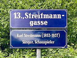| Straßenschild der Streitmanngasse in Wien-Auhof. | Eigenes Werk | Funke | Datei:Streitmanngasse Wien Straßenschild.jpg |