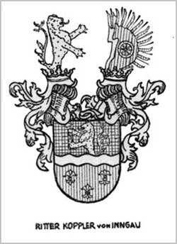 | Exlibris des k.u.k. Hof- und Gerichtsadvokaten Dr. Karl Koppler von Inngau (1844–1918), auf den 1883 der Ritterstand, das Prädikat "von Inngau" und das Wappen seines Schwiegervaters Karl Wagner von Inngau (1819–1893, Präsident des Handelsgerichts in Wien) übertragen wurden. | Eigenes Werk | Stadtmuseum Schärding | Datei:Exlibris - Koppler von Inngau (1883).jpg | |