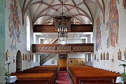 | Blick Richtung Orgelempore in der röm.-kath. Pfarrkirche hl. Valentin in der oberösterreichischen Gemeinde Weyregg am Attersee . Die spätgotische Kirche wurde in der zweiten Hälfte des 15. Jahrhunderts errichtet und 1931/1933 umgebaut sowie erweitert. Die Seccomalereien an den Wänden sind Werke von Karl Weiser aus den Jahren 1951/52. Die 1963 geweihte Orgel wurde von Hubert Neumann aus Götzis begonnen und von Wilhelm Zika (Oberösterreichische Orgelbauanstalt) fertiggestellt. | Eigenes Werk | C.Stadler/Bwag | Datei:Weyregg - Kirche, Innenansicht Richtung Orgelempore.JPG |
