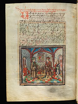 | Verpfändung des Breisgau, des Sundgaus und des Elsaß durch Herzog Sigmund von Österreich an Herzog Karl von Burgund am 9. Mai 1469 | Luzern, Korporation Luzern, S 23 fol., p. 154 – Illustrated Chronicle by Diebold Schilling of Lucerne (Luzerner Schillling) ( http://www.e-codices.unifr.ch/en/kol/S0023-2/154 ) | Diebold Schilling der Jüngere (1460-1515) | Datei:162Sigmund verpfändet BSE an Karl v Burgund.jpg | |