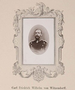 | Karl Friedrich Wilhelm von Witzendorff (* 28. April 1824 in Scharnebeck; † 23. März 1891 in Göttingen) war ein preußischer General der Kavallerie. | http://www.museen-nord.de/Objekt/DE-MUS-076111/lido/P4-W-31 | Verlag der "Militaria" Verlagshandlg., Berlin. | Datei:Karl-Friedrich-Wilhelm-von-Witzendorff.jpg |