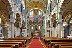 In den Wänden der Seitenschiffe sind höhenangepasste leicht farbige Rundfenster eingelassen. Im Hauptschiff befinden sich in der Bauflucht der Joche oben weitere allerdings dreibahnige Rundfenster, vor denen im Inneren kleine Säulen die Bahnen begrenzen bzw. abstützen. Oberhalb des Chorbogens ist mittig die heilige Familie gemalt, beiderseits schweben Engel heran.