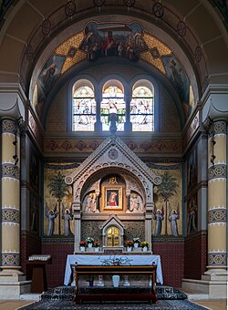 Über dem Hochaltar der Kirche befindet sich ein großes Wandbild, das Engel und Heilige um die Heilige Familie zeigt. Es stammt von Josef Kastner, der auch das Hochschiff mit Szenen aus dem Leben der Heiligen Familie versah.[4] Der Hochaltar selbst wurde von Ludwig Schadler gestaltet und zeigt die vier griechischen Kirchenlehrer, dahinter eine Kreuzigungsgruppe.