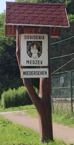 | Departure sign when leaving Metzenseifen towards Štós. | Eigenes Werk | Agentxp22 | Datei:Metzenseifen Wiedersehen.png | |