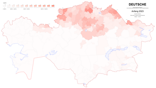 | Anteil der deutschen Bevölkerung nach administrativ-territorialen Einheiten der 2. Ebene der Republik Kasachstan. | Eigenes Werk | Остерман | Datei:Ostermann-germans-2023-1-deutsch.png |