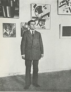 | Malevich standing most probably in the Museum of Artistic Culture, Petrograd. | monoskop.org | Autor/-in unbekannt Unknown author | Datei:Kazimir Malevich with his paintings in Leningrad 1924.jpg |