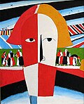 Einen radikalen Umbruch ab Ende der 1920er Jahre in Malewitschs Werk stellte die Rückkehr zur figurativen Malerei mit suprematistischen Elementen dar; er stellte sie in den Dienst der geliebten Bauern, die unter der Zwangskollektivierung der Landwirtschaft zu leiden hatten, was sich in seinem neuen Stil ausdrückte. In seiner Malweise wurden die Menschen nach und nach zu verstümmelten Puppen, zu Gefangenen eines verbrecherischen Gulag.[26]