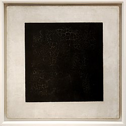 Das bekannteste seiner Bilder ist das suprematistische Das Schwarze Quadrat auf weißem Grund von 1915, mit dem Malewitsch durch die im Kubismus begonnene Abstraktion einen Höhepunkt erreichte. Malewitsch leugnete in seinem die Ausstellung „(0,10)“ begleitenden Manifest jede Beziehung der Kunst und ihrer Darstellungen zur Natur. Er ließ damit selbst die damals aktuellen Tendenzen der Avantgarde hinter sich, denn der Kubismus forderte nicht die absolute Gegenstandslosigkeit des Bildinhalts, wie Malewitsch sie nun in seinen Werken anwandte. Die Struktur des Schwarzen Quadrats wurde durch kleine impressionistische Pinselstriche geschaffen, nicht mit dem Lineal und einer einheitlichen Farbfläche, die Ränder des Vierecks sind zerfasert.[32] In den Jahren 1923 und 1929 sollte er weitere Bilder mit dem Thema „Schwarzes Quadrat“ schaffen. Ebenfalls im Jahr 1915 malte er Das Rote Quadrat. Nach einem gelben Parallelogramm auf Weiß folgte 1919 Weißes Quadrat, ein weißes Quadrat auf weißem Grund, mit dem die Quadratserie abgeschlossen wurde. In seinen suprematistischen Gemälden findet man außer Schwarz und Weiß die Grundfarben der Palette: Rot, Blau, Gelb und Grün.