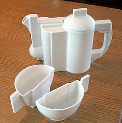 Ab 1923 befasste sich Malewitsch mit Architekturstudien; seine Architektone genannten räumlichen Projekte, Gipsmodelle in suprematistischer Form, waren bei den Bauhaus-Architekten 1927 nicht auf Gegenliebe gestoßen und standen auch in Petrograd im Gegensatz zu Tatlin und seiner Gruppe. Wohnsiedlungen für den Weltraum (Planiten) und Satellitenstädte (Semljaniten) waren innerhalb seiner Studien ein Thema, die er als „Architekturformeln, nach denen den Architekturgebilden die Form gegeben werden kann,“ beschrieb.[40] Malewitsch beschäftigte sich ebenfalls mit Produktgestaltung und schuf Porzellan-Services im konstruktivistischen Stil.
